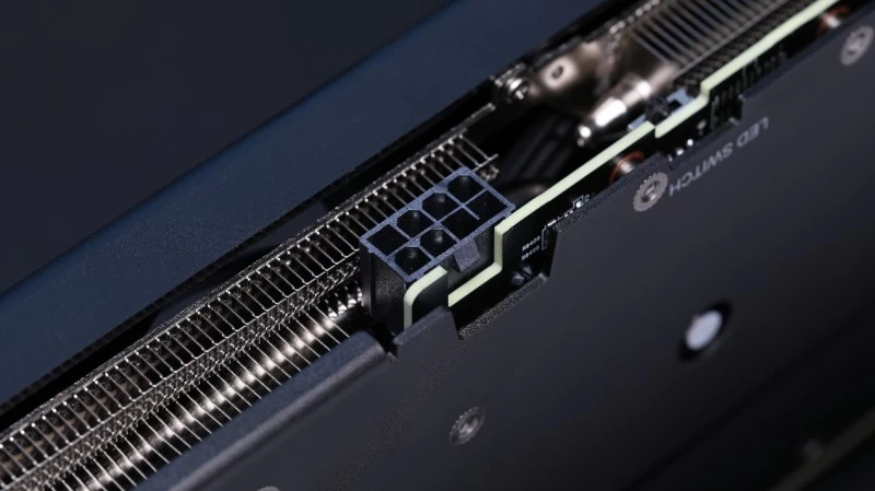 信仰灯的开启/关闭,以及性能模式切换按钮被放在顶部位置,旁边则是单8pin供电接口。撼讯RX 9060XT暗黑犬16G标称最大TBP功耗为175W,如果原有电源功率足够,完全可以省下这部分升级的钱。PS:这算不算平衡了用户升级成本?