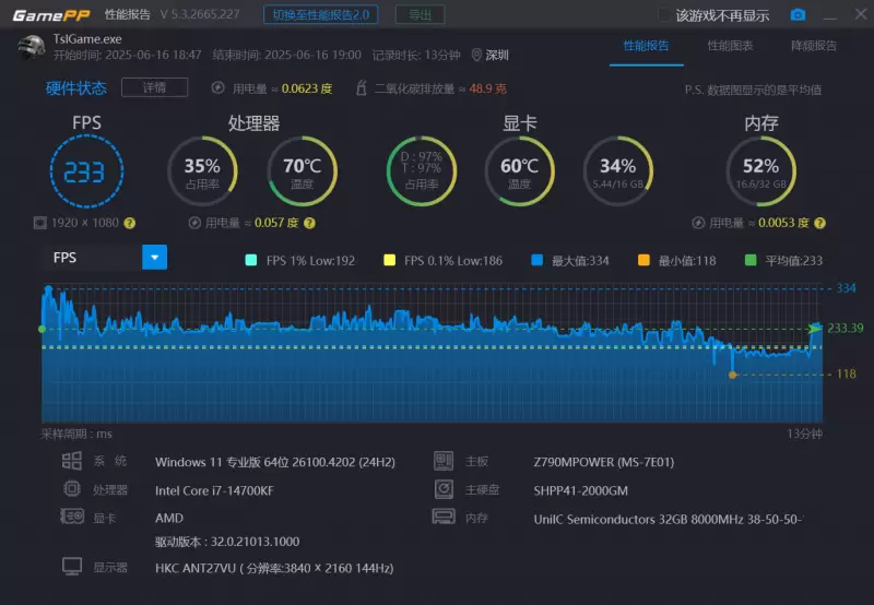《绝地求生》在1080P高画质下:OC档平均帧率233 FPS,1% low帧192 PFS;静音档平均帧率230,1% low帧195 FPS。