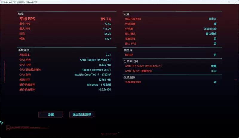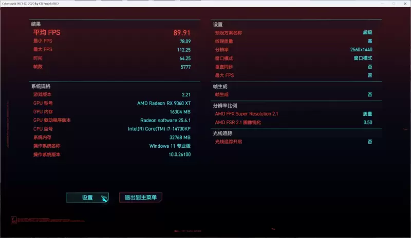 《赛博朋克2077》在2K分辨率超级预设画质下:OC档平均帧率89.91 FPS,最低帧率78.09 FPS;静音档平均帧率89.14 FPS,最低帧率77.66 FPS。