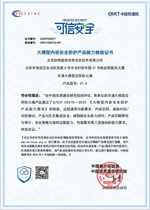 首批! 启明星辰大模型应用防火墙通过中国信通院“可信安全”评估