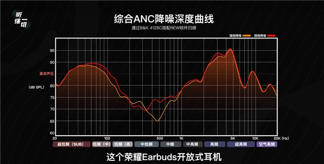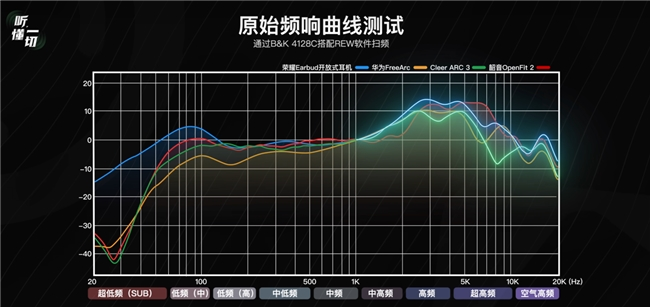 在音质方面,从专业B&K 4128C测试显示结果来看,整体听感上,荣耀Earbuds开放式耳机低频量感更为充足,人声表现更清晰且位置更靠前,中高频部分的抬升也更为明显,在聆听管弦乐等复杂曲目时能呈现更丰富的细节。