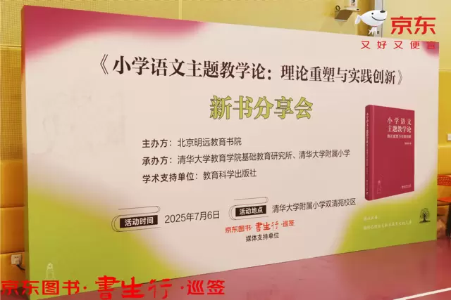 近日,由北京明远教育书院主办,清华大学教育学院基础教育研究所、清华大学附属小学承办,教育科学出版社和京东图书「书生行」巡签联合支持的《小学语文主题教学论:理论重塑与实践创新》新书分享会在清华大学附属小学举行。该书是清华大学附属小学校长、清华大学教育学院基础教育研究所所长窦桂梅团队三十余年探索小学语文主题教学的学术成果集结,活动吸引了全国众多教育工作者线上线下热情参与。