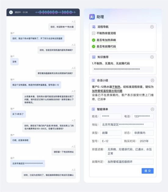 另外,通过统一平台,天润融通还为四季沐歌的坐席人员提供了强大的座席辅助功能。当客服进行人工接待时,客户端页面能够实时识别客户问题,并推荐最佳回答方案。同时,系统还能将语音内容实时转写成文字记录,并识别客户的历史来电记录,当用户短期内多次来电时,系统能判断是否存在未完工的工单,并及时提醒客服人员,确保服务连贯高效。