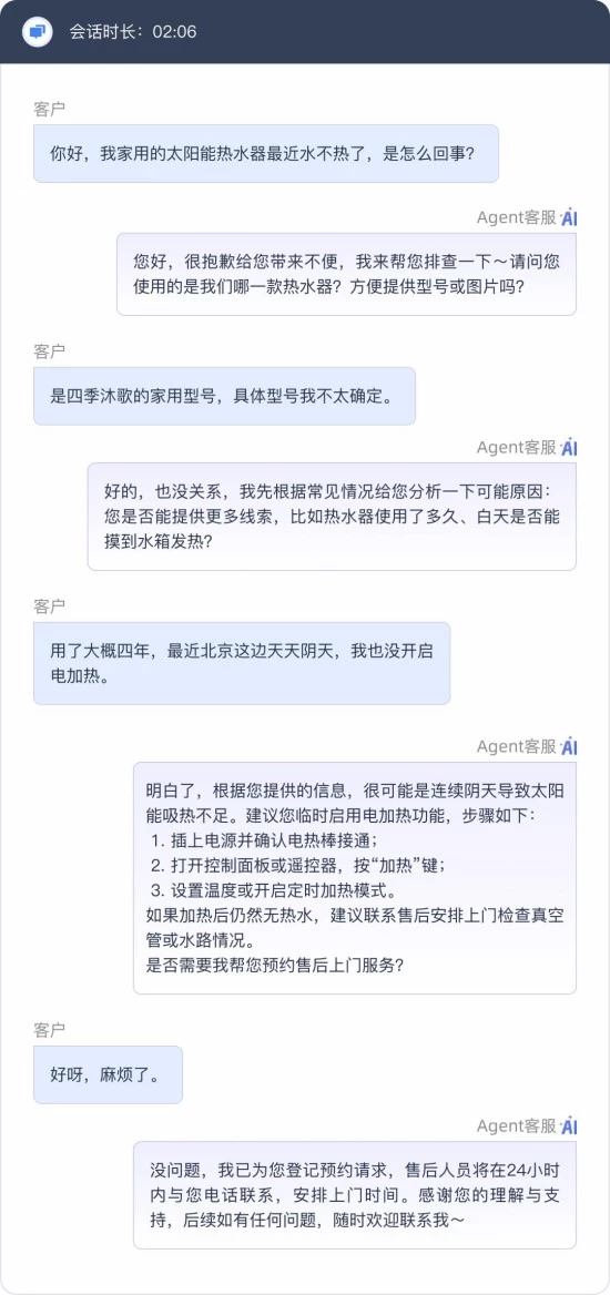 当然,渠道统一也会带来工作量的激增,服务质量难以统一、数据管理复杂等挑战。这导致传统以人工座席为主的服务模式已经难以适应新的服务场景,加入AI成为企业提升服务效率和服务品质的必选项。为了应对全渠道涌入的大量咨询,四季沐歌引入了天润融通的Agent客服,实现了7x24小时在线应答。与传统依赖FAQ的文本机器人不同,Agent客服拥有超长上下文记忆能力,能够识别语音、图片、表情、文档等多种内容,可以使用自然语言与客户进行多轮对话,让客户感受如同真人一样自然。Agent客服不仅能自动接待客户,还能主动处理事务。例如,当用户提出售后维修或配件需求时,Agent客服能自动创建工单,并通过钉钉群流转至相关工程师,实现服务流程的自动化。即使遇到无法解决的复杂问题,Agent客服也能无缝转接至人工坐席,确保服务不中断,体验更顺畅。目前,四季沐歌的智能客服拦截率已超过80%,绝大部分常规咨询都能由Agent高效自主完成。