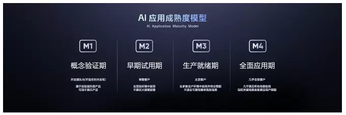 基于此,飞书今天发布了业界首个AI 应用成熟度模型。飞书将 AI 应用分四个等级:M1——概念验证,只做内部演示,别对外发布;M2——早期试用,给愿意尝鲜的用户用;M3——成熟应用,可以大规模使用;M4——完全成熟,在适合的任何场景都可使用。