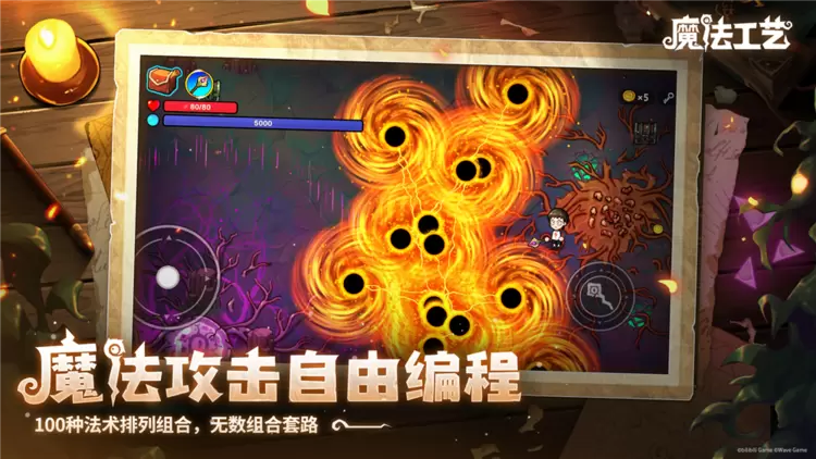 《魔法工艺》的核心魅力在于其“魔法编程”系统。游戏内提供了100种法术符文供玩家自由组合,每一种符文的顺序调整都会直接影响法术的实际效果。例如分裂、旋转、弹射、穿透等基础能力,更复杂的还有诸如悬停、追踪目标、触发连携等前置效果。这些机制并非孤立存在,而是能够彼此叠加融合,创造出如“分裂+追踪+穿透”这样兼具制导与输出的复合型法术。正如玩家们常说的那样,在《魔法工艺》的世界里,想象力就是最强的魔法源泉,你的创意决定了法术的上限。