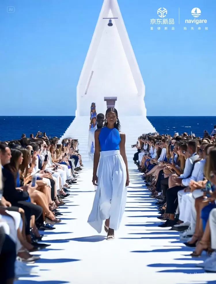 navigare 携手京东全程赞助阿那亚大舷墙海生活节的服饰,不仅达成了航海文化从符号到生活方式的升级,更呈现出一场震撼的 AI 大秀。这场大秀以阿那亚为背景,通过虚拟AI展示秋冬新品,以数字再生模式探索时尚新链路,尽显时装美学。
