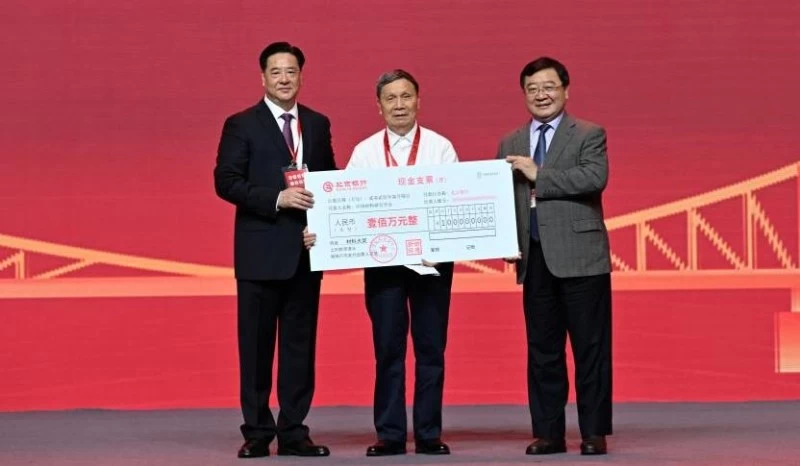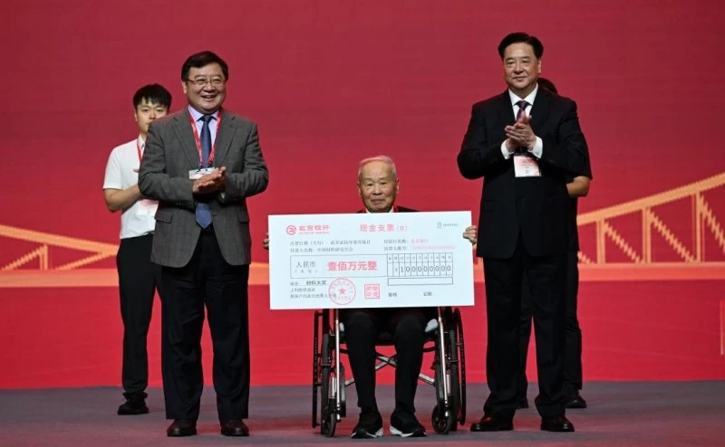 谢建新院士首先宣读了奖励委员会写给周廉院士的颁奖词,颁奖词中提到“从超导临界电流突破,到钛合金重器攻坚一线,周廉院士以毕生科研热忱,凭战略科学家之远见,擘画国家重大科技蓝图。数十载科研征途,自西迁三线淬炼岁月中走来,熔铸于心的坚韧,化为胸怀国之大者、矢志报国的磅礴力量,推动他将个人奋斗汇入时代洪流,聚焦国家重大需求,以艰苦奋斗的实干精神,在超导与钛合金等前沿领域勇攀科技高峰。”获奖人周廉院士坐轮椅上台,中国材料研究学会理事长魏炳波院士、李元元院士分别将金质奖章和100万元支票授予周廉院士。周廉院士发表了获奖感言,他在获奖感言中说“感谢学会授予我这份崇高荣誉!”“如今八十五岁,我仍时刻关注着中国材料事业的发展。”“衷心祝愿:中国材料产业根深叶茂,材料工业日益强盛!”