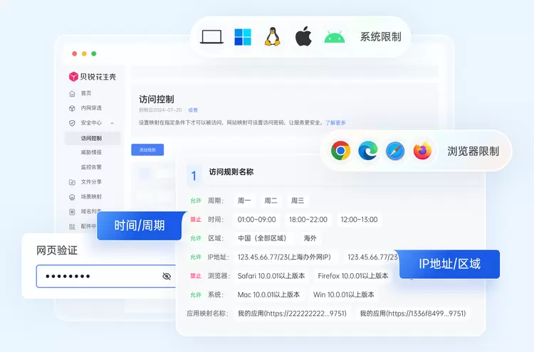 此外,花生壳还支持多维访问权限控制机制,可精细设置访问时间段、IP地址/地理区域、浏览器/操作系统等多重限制条件,实现对连接行为的全程可控与可追踪,配合实时状态监控与多渠道告警通知,进一步提升整体安全性与响应能力。