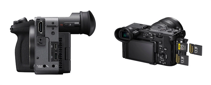 索尼ILME-FX2的拓展接口(左)和双卡槽设计(右)
