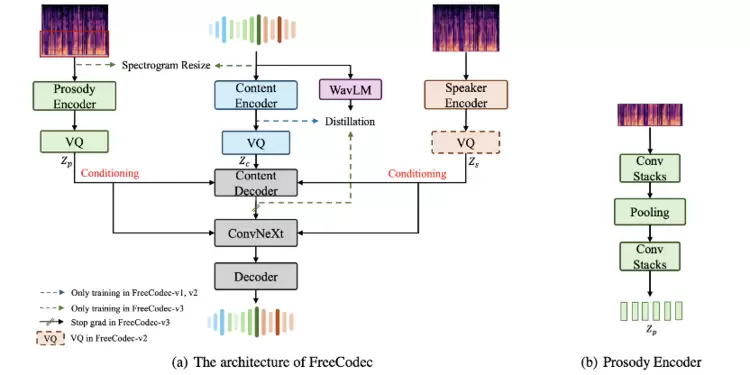 神经语音编解码器凭借其利用离散令牌表征实现的卓越重建效果而备受瞩目。它是语音编码和大型语言模型(LLM)等生成任务中的关键组件。然而,大多数基于残差矢量量化的方法由于在建模复杂耦合信息方面的编码效率较低,导致在使用较少令牌时性能欠佳。本文提出了一种名为FreeCodec的神经语音编解码器,它通过将语音的内在属性解耦到不同组件,采用了一种更有效的编码框架:提取一个全局向量作为音色信息;使用一个具有长步幅级别的韵律编码器来建模韵律信息;内容信息则来自一个内容编码器。