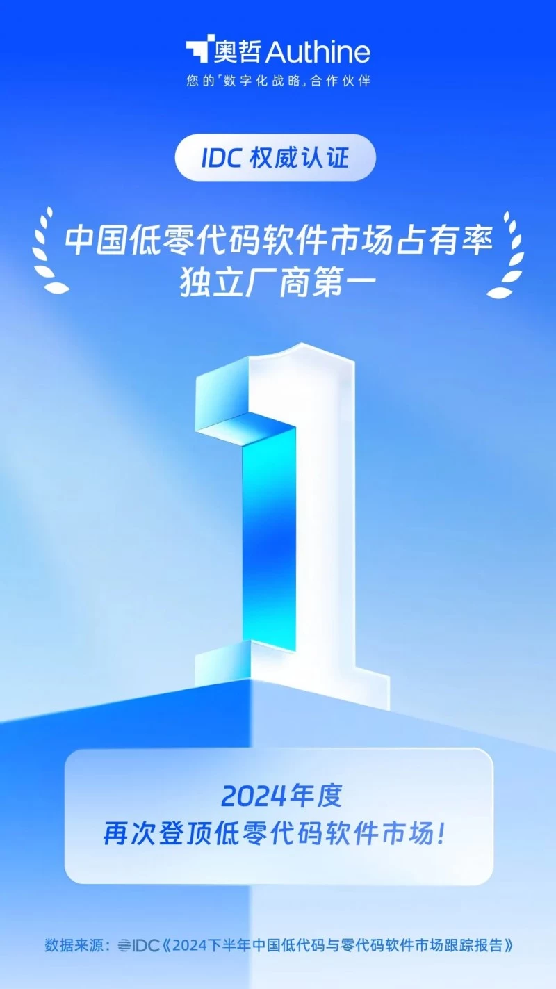 数据显示,2024年,奥哲再次获得中国低零代码软件市场独立厂商第一!