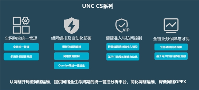 多场景零配置开局管理:新业务上线:减少复杂的开局操作,配置预先在UNC规划,设备上线自动下发,真正实现零配置开局;网络扩建:基于更换设备配置自动下发、扩展简易实现。