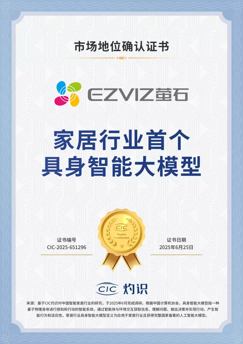 近日,萤石自研的“萤石蓝海大模型”正式获得由知名权威咨询机构CIC灼识咨询颁发的“家居行业首个具身智能大模型”市场地位确认证书。