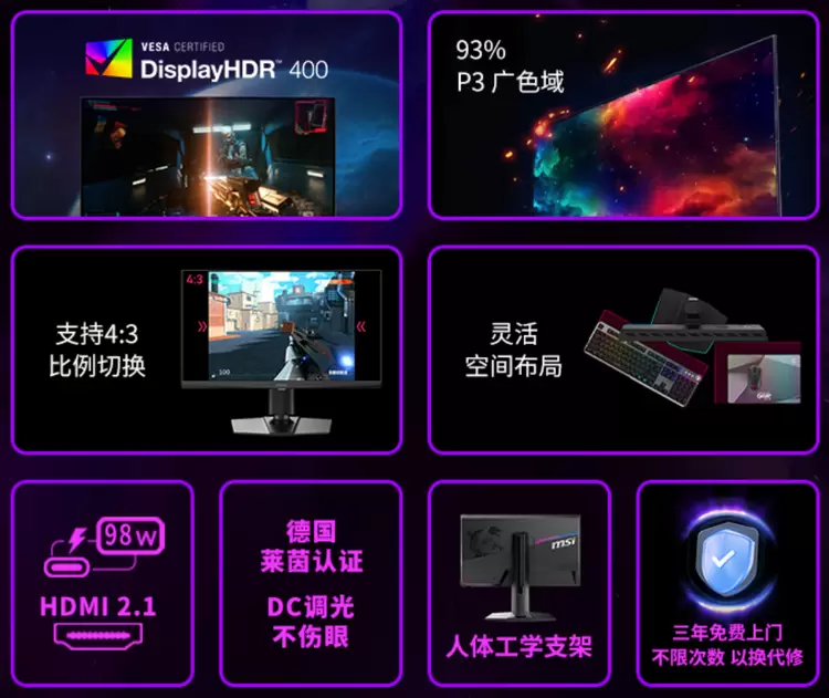 硬核色彩表现:突破TN面板色彩局限,覆盖93% DCI-P3广色域,并通过VESA DisplayHDR 400认证,画面色彩鲜活生动,明暗细节层次分明,战场环境尽收眼底。