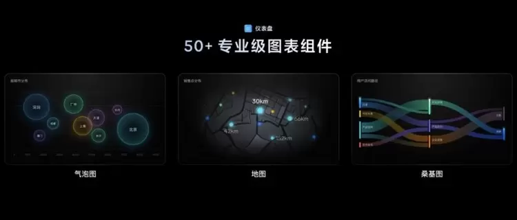 不止这些,我们还进一步增强了仪表盘的 数据可视化能力 ,新增了一批专业级的 BI 图表组件,例如气泡图、地图以及桑基图等等。
