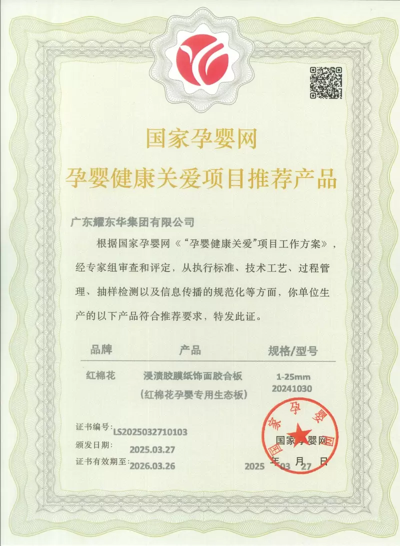 红棉花板材的环保母婴级属性,是其最核心的竞争力。2023年,红棉花荣获“母婴专用板十大品牌”,其产品甲醛释放量远低于国家标准,并于2025年纳入国家孕婴网“孕婴健康关爱项目推荐产品”。品牌采用进口原木单板与环保胶黏剂,从基材到饰面全程执行ENF级(≤0.025mg/m³)环保标准,并获得日本F☆☆☆☆体系认证,确保孕婴人群的居家安全。