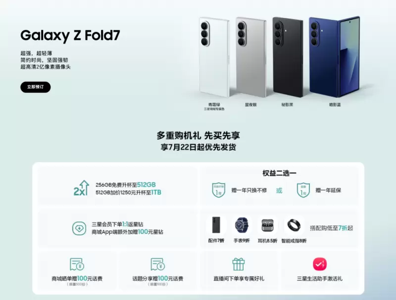 目前,三星 Galaxy Z Fold7 已在 7 月 9 日 23:00 开启预约,7 月 25 日全渠道开售 ,起售价 13999 元,提供暗影蓝、星夜银、秘影黑、青霜绿(三星商城专属颜色)4 种配色 。即日起至 7 月 24 日 24:00,预约用户可享升杯好礼,即购买 12GB + 256GB 版本,可免费升级到 12GB + 512GB 版本,同时还可加价 1250 元将 512GB 版本升级至 1TB版本 。凡是预约并购机的用户,均可获赠 “一年只换不修” 或 “一年延保” 二选一好礼及更多购机礼遇 。7 月 17 日前预约的用户,还可享提前发货权 。