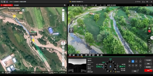 在实际操作中,一台 M400 无人机升高作为中继机,另一台作为作业机前飞,O4 图传行业增强版支持 Sub2G 频段,最远可进行 40 公里图传,轻松突破山体遮挡的限制,稳定传输信号。
