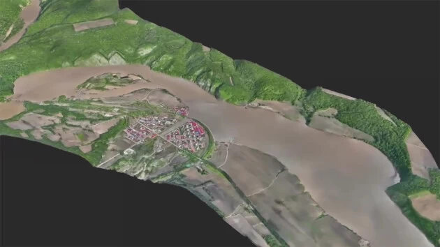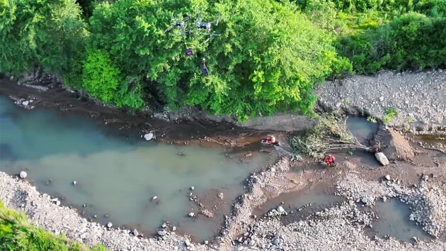灾区河流水位暴涨,落水车辆被困河道。危急的时刻,M400 无人机搭载高精度航磁探测器迅速起飞作业,对河道开展全方位扫描。