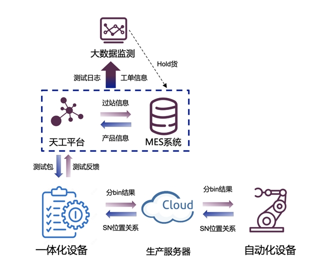 ● 生产与测试协同:一体化设备对接天工平台,执行测试指令并实时反馈测试结果,天工平台与MES系统交互产品和过站信息。