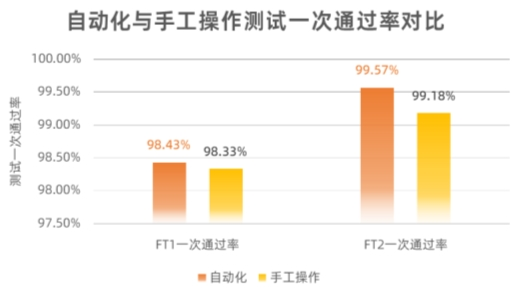 精准策略控制:相较人工操作,自动化产线采用软硬一体化精准测试后,成效显著,小批量工单直通率提升至99.80%,FT/BI一次通过率分别达98.43%和99.57%。