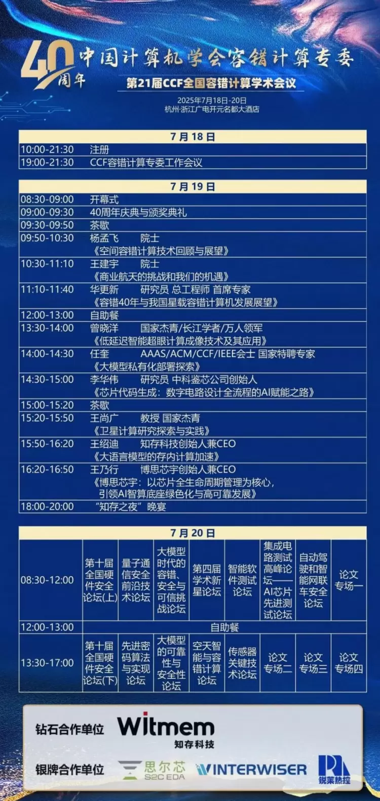 本次会议以“容错四十载,AI启新时代”为主题,内容覆盖航天、自动驾驶、量子通信、大模型、软件、器件、芯片、EDA、可靠性、测试、安全等多个领域。会议将邀请来自全国各地的专家学者及业界代表,预计参会人数将超过800人。会议将通过高质量的前沿技术报告、学术论文分享及专题论坛等形式,深入探讨容错计算技术的研究进展与发展趋势,促进学术界与产业界的广泛合作与交流。大会还将对过去40年的容错计算重要成果进行展示和总结。