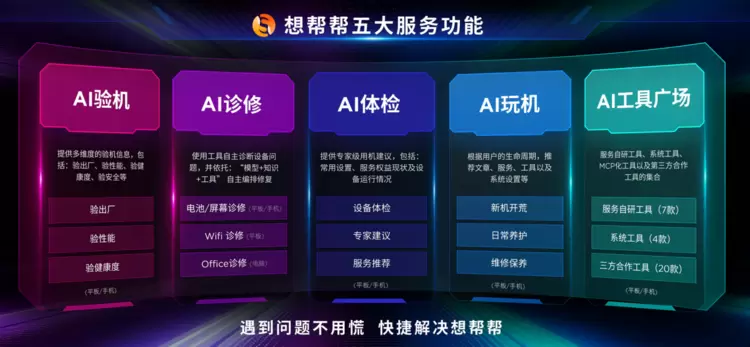 本次升级的核心在于五大AI服务功能的系统性强化。AI验机提供涵盖出厂信息核验、性能测试、健康度评估及安全检测的多维度深度验机服务;AI诊修依托“智能模型+知识库+工具库”三位一体架构,实现设备问题的自主诊断与修复方案编排;AI体检通过全面扫描设备状态,为用户输出专家级优化建议,包括常用设置调优、服务权益状态提示及运行效能分析;AI玩机基于用户设备生命周期动态推荐个性化内容,如精选文章、优惠方案、实用工具及系统设置技巧;AI工具广场则整合了联想自研工具、原生系统工具、MCP化工具及第三方合作工具,形成强大的服务生态集散中心。五大服务功能协同发力,全面扫清用户在移动设备使用中遇到的各类障碍,真正兑现想帮帮“遇到问题不用慌,快捷解决想帮帮”的服务承诺。
