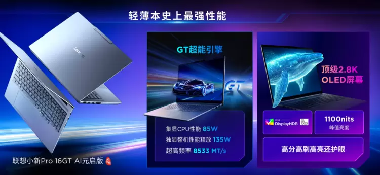 除了手机,联想小新和YOGA也相继在活动上亮相。联想小新14 360 AI元启版搭载英特尔第二代酷睿Ultra 7处理器,支持4096级压感手写笔触控操作,配合360°自由翻转设计,兼顾创作灵活性与强悍性能,成就翻转本品类性能标杆。同步亮相的联想小新Pro 16GT AI元启版则凭借GT超能引擎实现85W满血性能释放,内存频率高达8533 MT/s,彻底打破轻薄本性能桎梏;其配备的16英寸2.8K OLED屏幕通过行业权威的TrueBlack 100认证,1100nits峰值亮度与120Hz刷新率协同,在护眼基础上缔造沉浸式视觉盛宴。