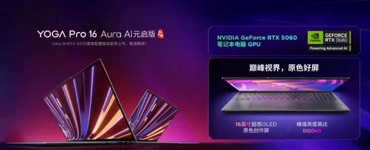 另外一款惊喜亮相的新品是联想YOGA Pro 16 Aura AI 元启版,它搭载了RTX 5060显卡,视频剪辑、3D渲染都不在话下。而且它还有一块16 英寸超感OLED原色创作屏,峰值亮度高达1100nit,室内室外都能看得通透。