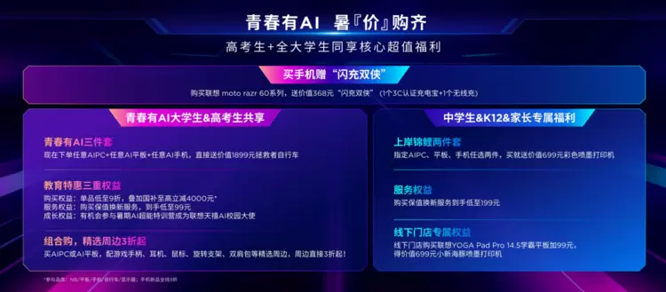 针对初中生和家长们,联想同步推出多种成长礼遇,选购指定AIPC、平板、手机任选两件的“上岸锦鲤两件套”,买就送价值699元彩色喷墨打印机;线下门店更是加码福利——亲临门店购YOGA Pad Pro 14.5学霸平板,仅加99元即可换购同款打印机。另外,购买联想moto razr 60系列手机,即赠价值368元包含169元3C认证的充电宝+199元无线充的“闪充双侠”套装。