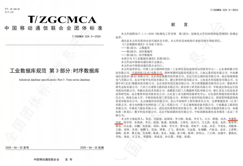 近日,中国移动通信联合会发布公告,由中国工业互联网研究院牵头制定的《工业数据库规范第 1 部分:云数据库》、《工业数据库规范第 2 部分:实时数据库》、《工业数据库规范第 3 部分:时序数据库》团体标准于2025年 6 月 25 日正式发布并实施。公布信息显示,天谋科技(北京)有限公司担任三项标准的核心起草单位,天谋科技 CTO 乔嘉林、COO 秦楚晴、数据库内核研发负责人田原、核心数据库内核开发工程师苏宇荣均担任标准主要起草人。