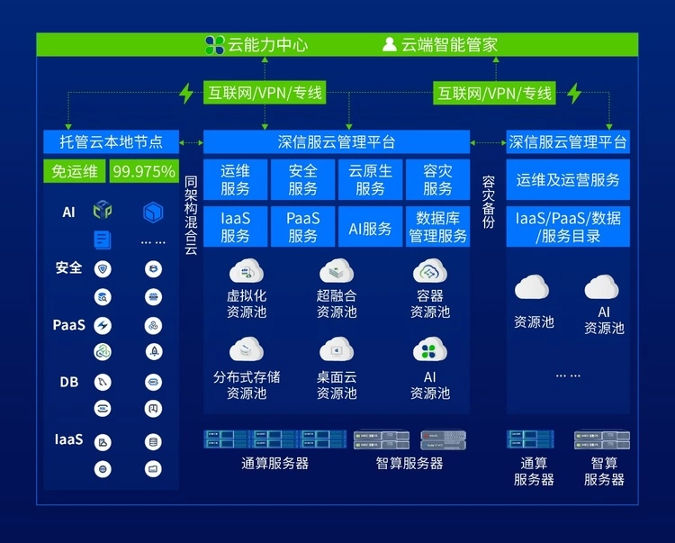 新升级的轻量云,支持超融合在现有集群中增加1台GPU节点,完成从传统承载平台向智算承载平台的演进。所有承载通算、智算的集群资源都可以在信服云管理平台SCP上进行统一纳管。