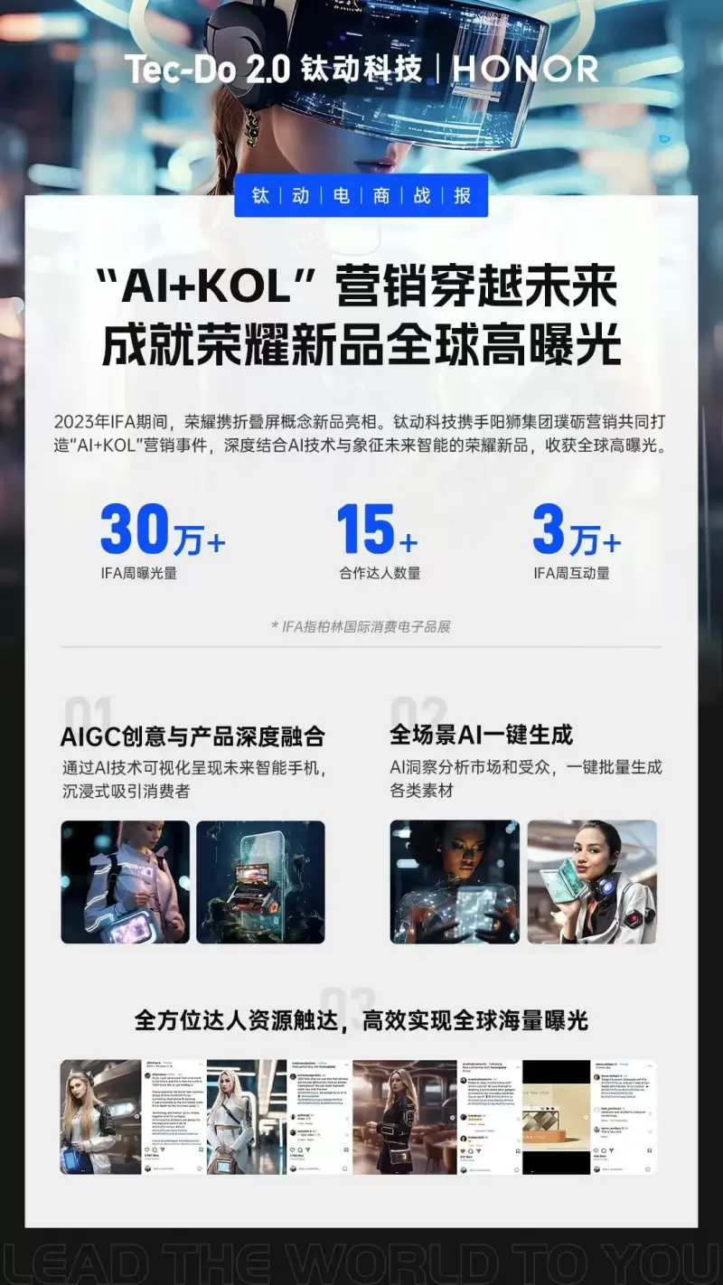 2023德国柏林消费电子展(Internationale Funkausstellung Berlin,以下简称IFA)召开期间,荣耀携折叠屏概念新品亮相。钛动科技携手阳狮集团创意代理璞砺营销共同打造“AI+KOL”营销事件,深度结合人工智能技术与象征未来智能的荣耀新品,在全球范围收获高曝光。