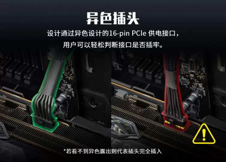 接口状态一目了然:创新的明黄色“异色设计”接口,用户只需观察接口边缘的亮色区域是否可见,即可轻松判断 16-Pin 显卡供电线是否完全插牢 (若看不到异色露出则代表插头完全插入),大幅提升安装安全性与便捷性。