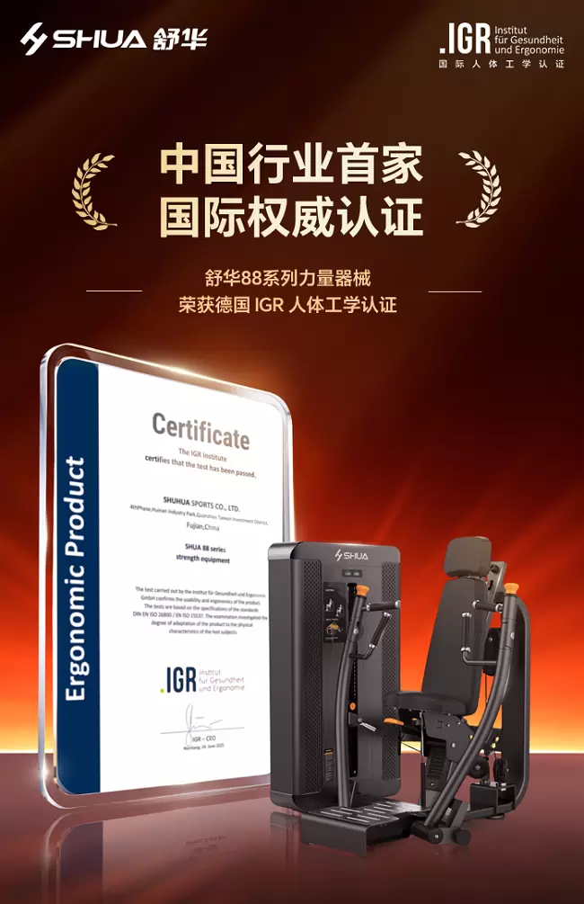 近日,舒华体育88系列力量器械正式通过严格的德国IGR人体工程学认证,成为国内首家获此国际认证的健身器材品牌。这一成果不仅是对舒华品牌技术实力的权威背书,更标志着其产品人体工程学设计已达到国际领先水平,为中国健身器材行业树立了人体工程学应用的新标杆。