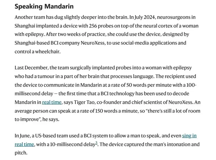 报道介绍了脑虎科技的两项里程碑案例:去年7月, 一名运动功能障碍患者在大脑皮层顶部植入脑虎科技设计的256通道柔性脑机接口。经过两周训练,患者可通过意念操作社交媒体应用并控制智能轮椅;同年12月,一名语言功能障碍患者植入同款设备,经训练,实现了普通话交流,速度达每分钟50字(约为普通人语速的三分之一),延时小于100毫秒。这是国际上首次实现汉语普通话的实时解码。