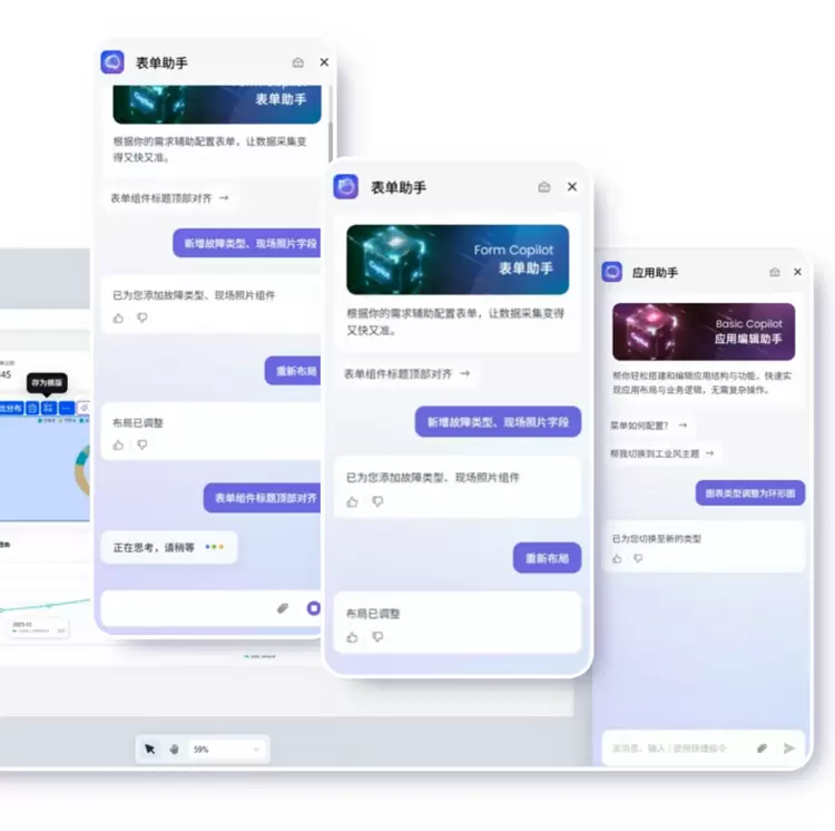功能精雕调优: 提供表单、列表等组件级的AI助手,辅助完成布局优化、数据绑定、规则配置等精细化操作。