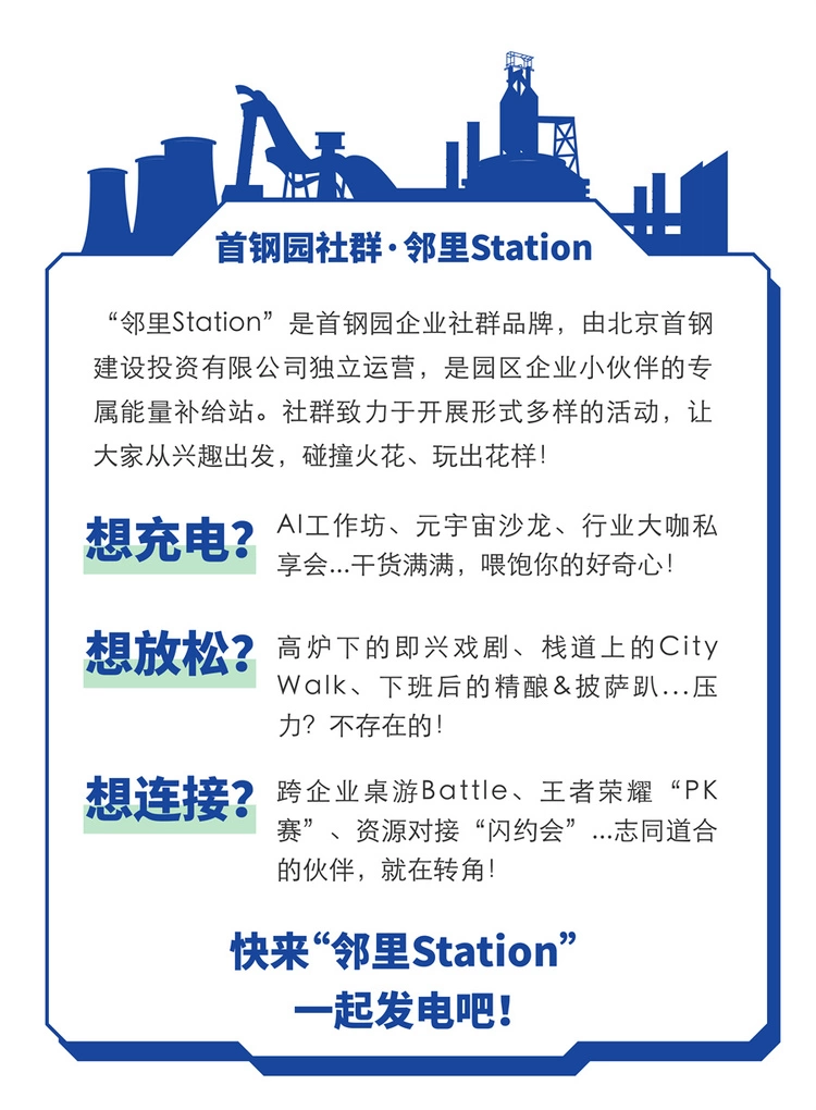 首钢园围绕科技创新、数字经济,按照面向未来、引领时尚的方向,在更广领域范围谋划产业发展,努力构建包括科幻、元宇宙、游戏、电竞、虚拟现实等数字空间产业矩阵。此次首钢园社群•邻里Station活动为推动首钢园区企业兴趣发展注入了新的源动力,后期首钢园将不定期为园区企业举办社群活动,敬请持续关注。
