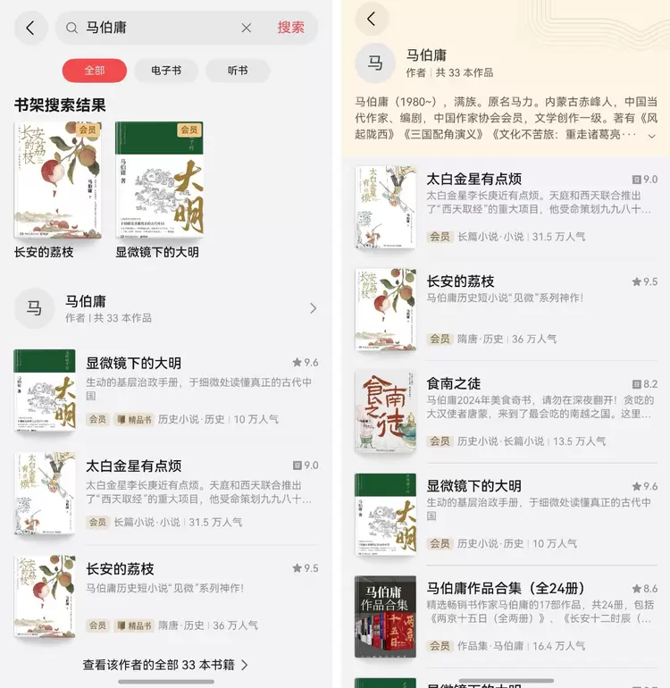 对于喜爱特定作家的读者,华为阅读同样提供了便利。在搜索栏直接输入作家名字,该作家所有已上架作品都会展示出来,搜索结果页以电子书、听书、作家页、关联推荐等多种卡片形式呈现,让读者能够迅速找到心仪之作,极大提升了找书效率。