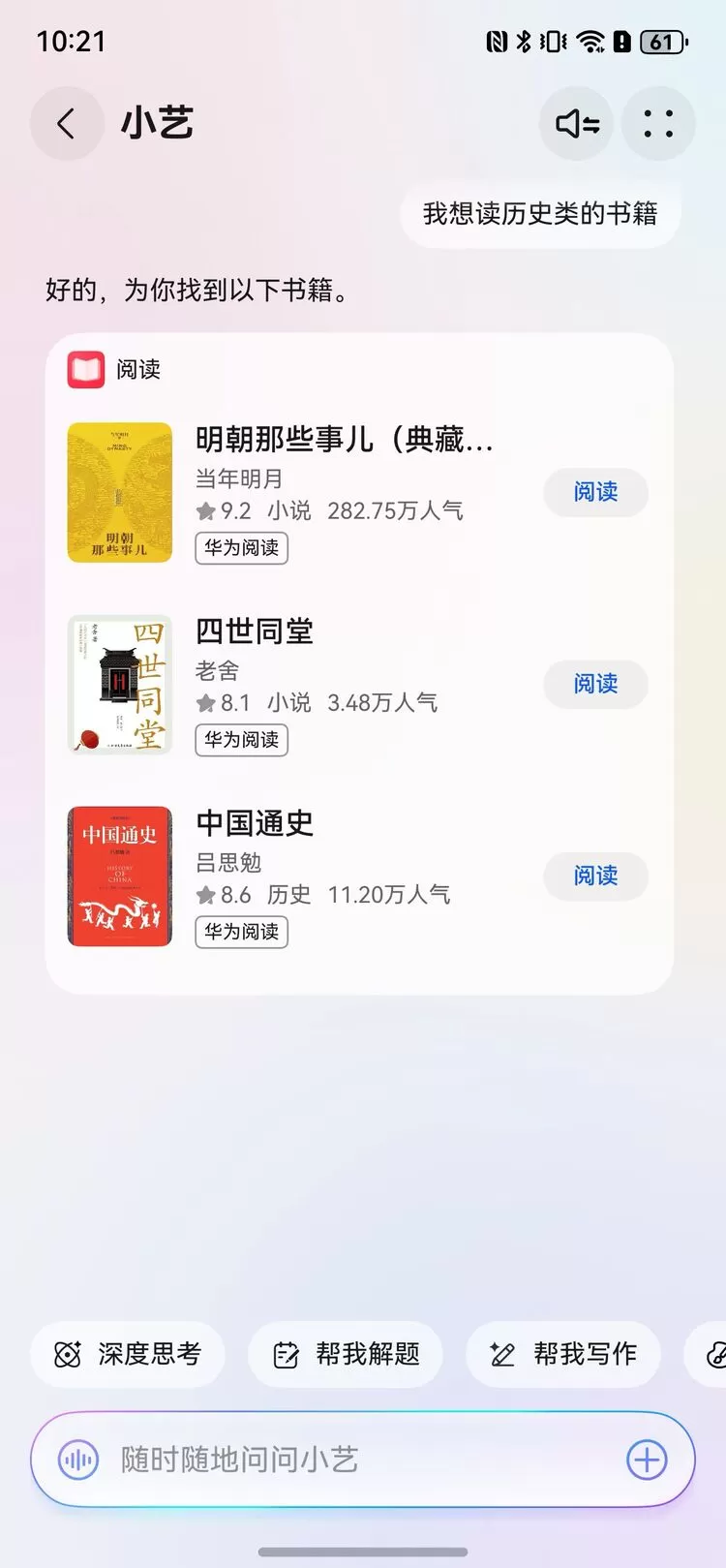 华为阅读与华为智慧助手小艺的联动,开启了 AI 阅读新时代。当面对琳琅满目的书籍不知如何选择时,用户只需向小艺提出问题,它就能智能分析用户喜好,推荐符合需求的好书。例如,当用户询问 “有没有关于历史文化的好书推荐”,小艺会迅速筛选出如《明朝那些事儿》《中国通史》等相关书籍,用户直接点击即可打开华为阅读畅读,小艺就像一位贴心博学的领读人,帮助用户严选好书。