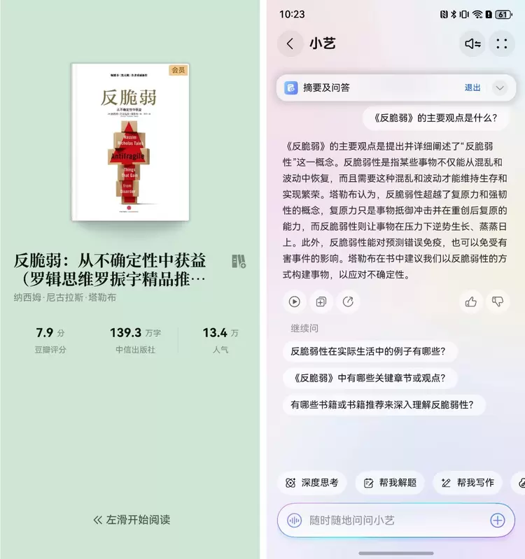 当用户想要分享书籍时,华为阅读的分享功能同样令人惊喜。在阅读器内点击 “分享” 按钮,选择小艺服务,它会自动 AI 生成书籍概要,精准概括书籍精华,让分享对象能够快速 Get 到书籍的魅力所在。例如,对于《反脆弱》这本书,小艺可能会生成这样的分享文案:《反脆弱》颠覆传统对 “稳定” 的认知,塔勒布提出,世界充满不可预测的黑天鹅事件,真正的强者不是规避风险,而是从不确定性中获益。就像火能烧毁木头,却能让钻石更坚硬,反脆弱的事物在波动、压力和混乱中不断进化、变得更强。还可以点击深度解读文章,查看更详细的书籍概要、脑图、精读总结等——这种智能分享方式,既节省了用户时间,又能让分享更具吸引力。
