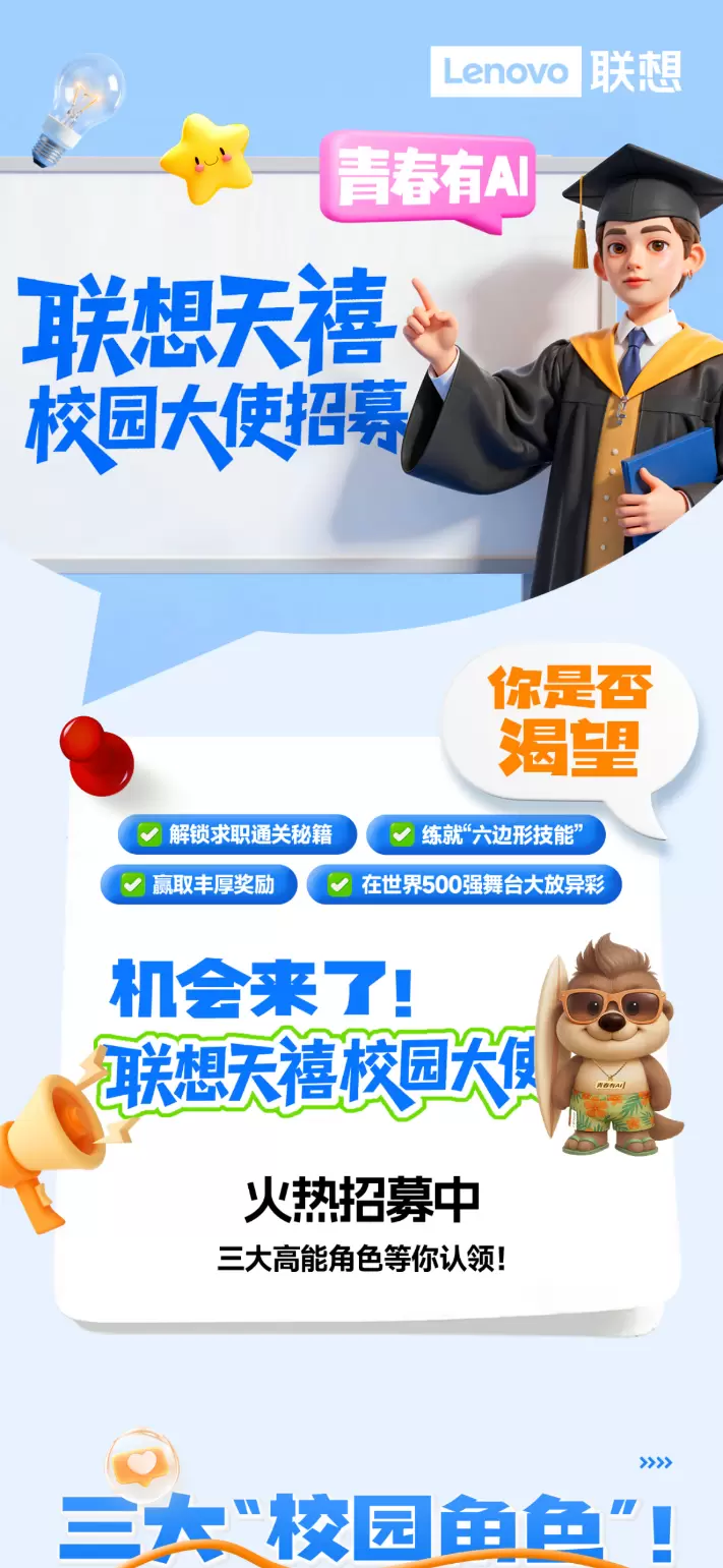 与之同步启动的“联想天禧校园大使计划”,以实践赋能为核心,为校园生态注入长效活力。该计划零门槛面向全国高校学生招募,设置品牌宣传官、活动传播员、校园内购官三大角色,分别承担品牌内容创作与社群运营、产品创意内容传播、内购福利推荐等任务。联想为大使提供样机体验、流量扶持等资源支持;表现优秀者可获得实习机会、实践证明、校招绿色直通资格及高管推荐信;大使还可通过完成内容创作、产品推广、人群拓展等任务积累积分,激发参与动力。配合7月16日至8月31日开展的联想大学生暑期超能AI特训营,这一体系清晰构建起“用AI、学AI、创AI”的成长路径,持续为校园AI生态闭环注入活力。