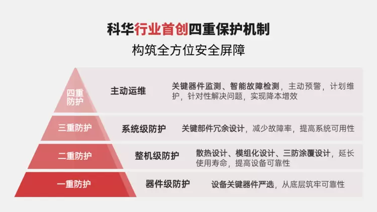科华深谙交通安全运营的重要性,坚持以“工业级产品设计理念”为核心,将“安全”基因贯穿产品全生命周期。产品采用科华行业首创的四重保护机制,从器件级选型、整机级维护、系统级冗余再到主动运维层层防护,构筑起从底层硬件到顶层管理的全方位安全屏障。