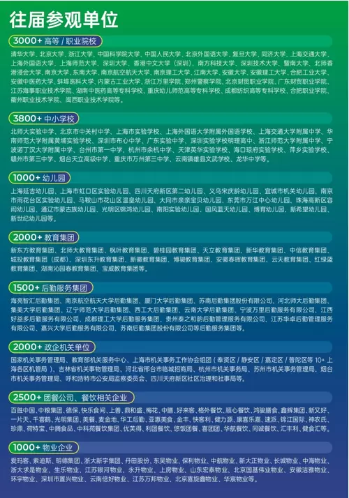 展会聚焦学校大后勤全领域,展示智慧餐饮、能源管理、校园信息化、校园物业、校园安全、健康空间、环保家具、商贸自助、基建与修缮、连锁品牌、校园文创、中小学后勤等12大领域N个细分业态的新产品、新服务、新方案。