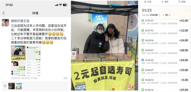 2020 年 4 月,乐荟城店顺利开业,该加盟商凭借着对苍井寿司品牌理念的深入理解和对市场的敏锐洞察,在当地迅速打开了局面,当年创收 96.3 万元;同年 9 月,凯德广场店开业,创收 91.7 万元;2021 年 5 月,长虹路文创店开业,创收 51.5 万元。在经营过程中,老板亲自上阵,推车摆摊、拍摄短视频,积极拓展客源,通过自身的努力和总部的支持,逐渐打造出了一个可复制的成功模式。2025 年,该加盟商迎来了事业的又一高峰,成功开设了第 4 家门店,实现了从单店到规模化发展的华丽蜕变,为当地的餐饮市场注入了新的活力,也为自己的创业之路书写了浓墨重彩的一笔。