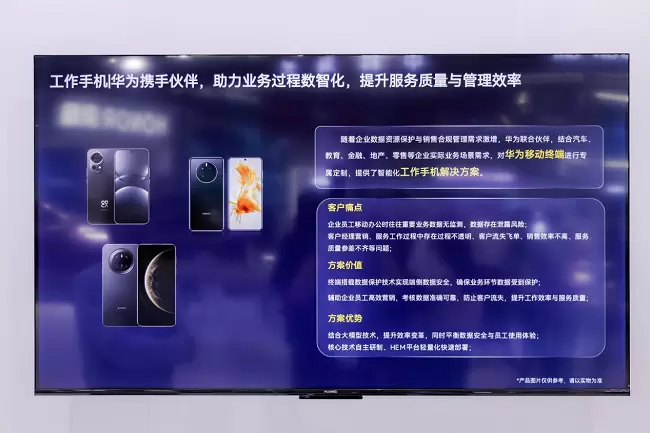 在数字化转型过程中,越来越多的企业要求终端设备既能够保障数据资源安全防止敏感信息泄露,又要为日常业务、营销业务合规办理、高效办理提供助力。华为擎云基于企业场景化需求,携手合作伙伴对华为移动终端进行专属定制,提供了工作手机方案。