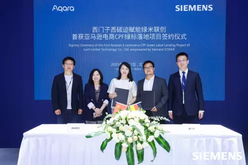 本次签约仪式以《碳链护航,绿标直通》为主题,由西门子(中国)有限公司副总裁、西门子数字科技(深圳)有限公司董事长胡建钧,亚马逊全球开店卖家合规团队总监安娜,以及 Aqara 董事长兼 CEO 游延筠共同见签。西门子西碳迹中国业务与生态拓展负责人闫韬与 Aqara 合伙人彭江波代表双方签署协议。