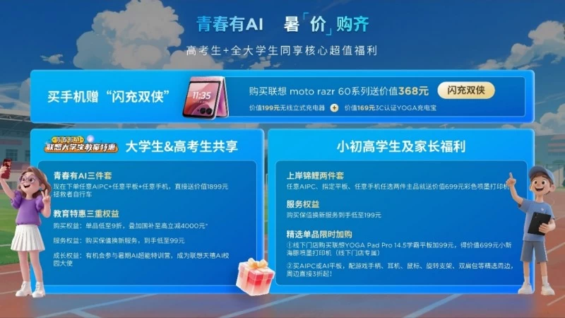 联想始终认为,释放青年AI潜能离不开强大的智能工具支撑。正值暑期,联想大学生“青春有AI”教育特惠计划已火热开启——7月1日至8月31日,针对大学生及高考生群体的AI终端暑期教育优惠正式上线:购买AI PC、AI平板、AI手机等产品,教育特惠价低至9折,叠加国家补贴后至高可立减4000元;若选购“青春有AI三件套”(任意AIPC+任意平板+任意手机),还能获赠价值1899元的拯救者自行车;购买联想motorazr60系列手机,则可获赠价值368元的“闪充双侠”套装。针对小初高学生及家长,“上岸锦鲤两件套”优惠同步开启:从任意AI PC、指定平板、任意手机中任选两件主品,即可获赠价值699元的彩色喷墨打印机,充分满足学习及家庭使用需求。服务权益方面,保值换新服务提供贴心保障:大学生及高考生专属“保值换新服务”低至99元,小初高学生及家长专属服务低至199元,有效缓解设备迭代的成本顾虑。