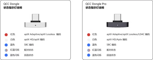 QCC Dongle Pro & QCC Dongle的状态指示灯,它能以直观的方式将设备连接状态与编码模式清晰呈现,用户无需复杂操作即可获取关键信息,让蓝牙设备使用更高效便捷。
